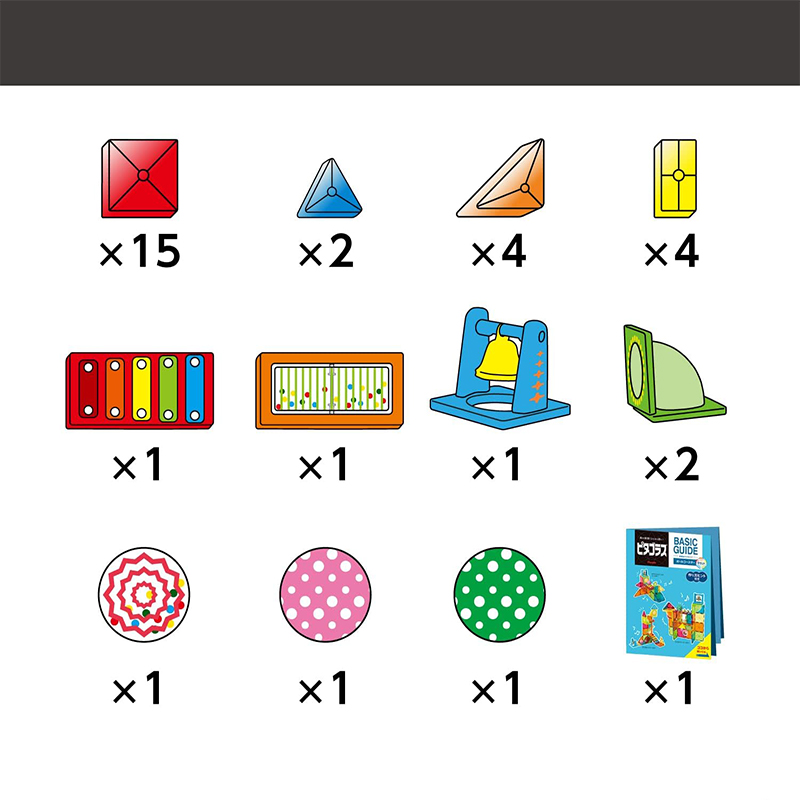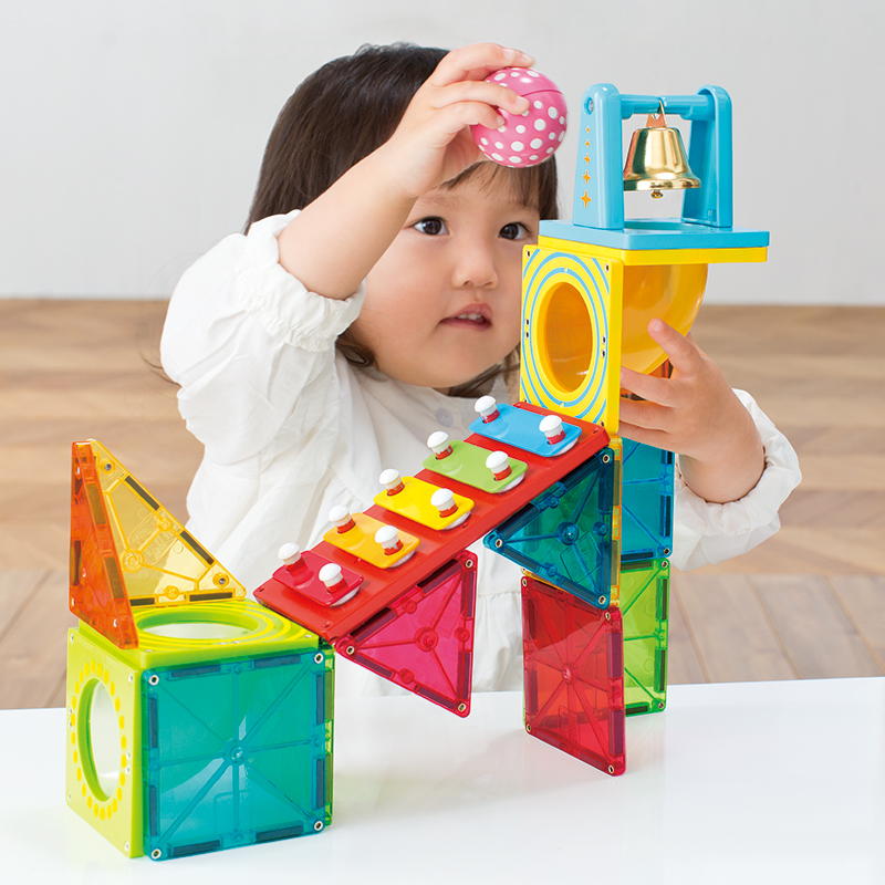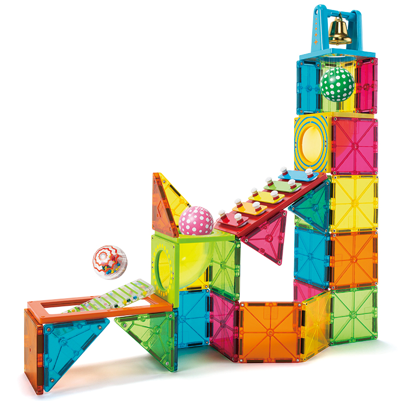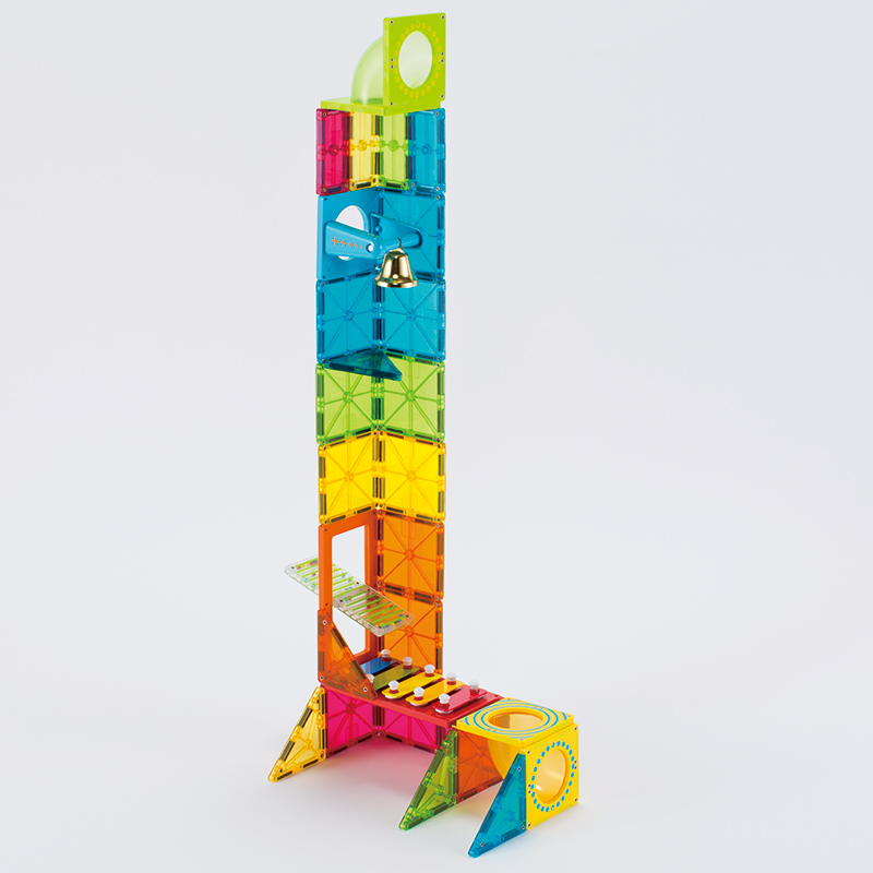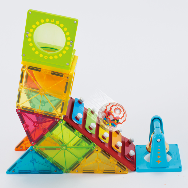 Rinkinyje rasite 33 detales (10 skirtingų rūšių), tarp kurių – kvadratai, trikampiai, vamzdinės detalės ir unikalūs garsiniai elementai: ksilofonas, varpelis, ir kamuoliukų sūpynės, kurie žaidimui suteikia dar daugiau linksmumo.